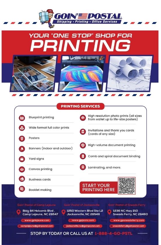 Print Services for Goin' Postal of Jacksonville, Sneads Ferry, and Camp Lejeune.